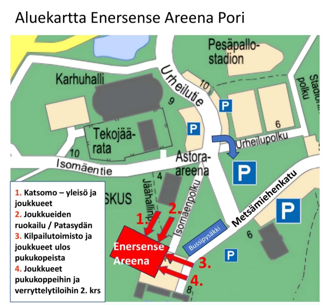 Pysäköintialueita löytyy jäähallin läheisyydestä runsaasti sekä henkilöautoille että busseille. Kilpailupäivänä pysäköinti Enersense Areenan pihassa ei ole yleisölle mahdollista. Henkilöautoille on jonkin verran pysäköintitilaa Metsämiehenkadun varrella jäähallin edessä. Isot pysäköintialueet ovat Tennishallin vieressä (Metsämiehenkatu 6) sekä Urheilukadun ja Metsämiehenkadun kulmassa, johon sisäänajo tapahtuu Urheilukadun puolelta ja Urheilupolku varovasti ylittäen (sininen nuoli kartassa).